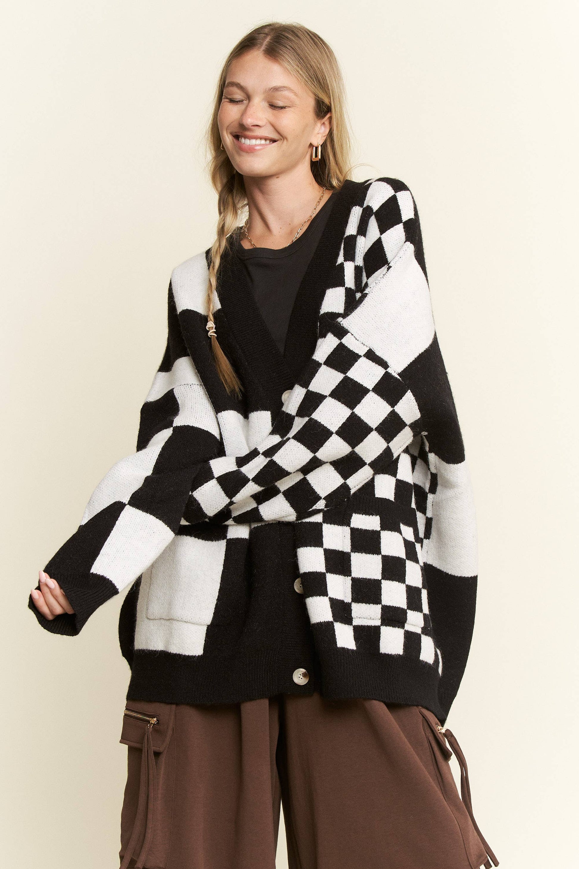 BUTTON DOWN LONG SLEEVE CHECKERED OVERSIZED CARDIGAN -Oversize cardigan -V-neckline -Ribbed Neckline -Front Button Closure -Drop Shoulder -Ribbed Sleeve Cuff -Ribbed Hem