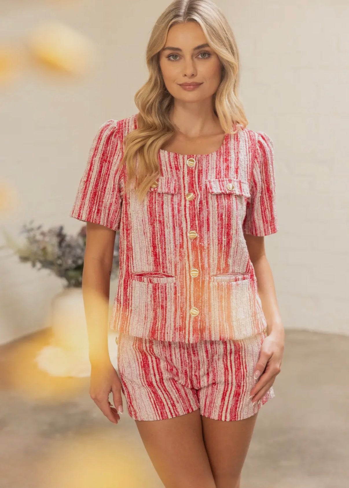 The cutest set!! This set can be worn to lunch with the girls, a celebration or Holiday party. A showstopper for sure! Comes as a set but you can wear the pieces separate from each other, the gold button detail really makes this a statement piece.